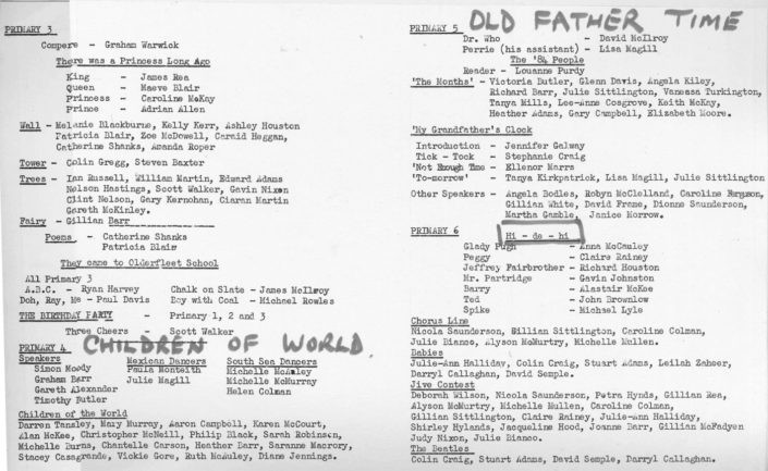 P.7 went to the Opera House to see Hiawatha. On October 18 Mrs Craig, Mrs Wright, Mrs McAuley, Mrs Haveron, Mrs Goldie and Mr Burns took their cars – in convoy!