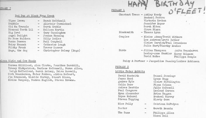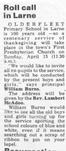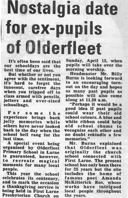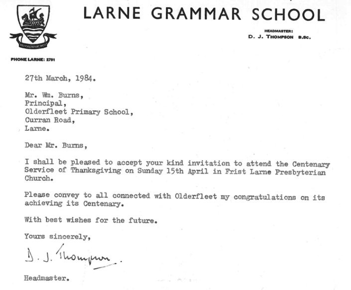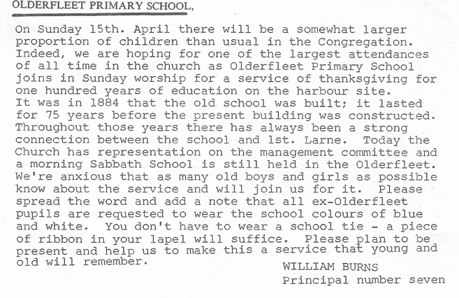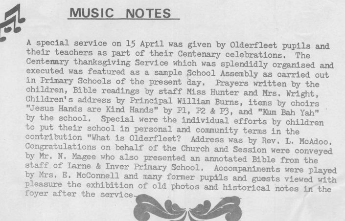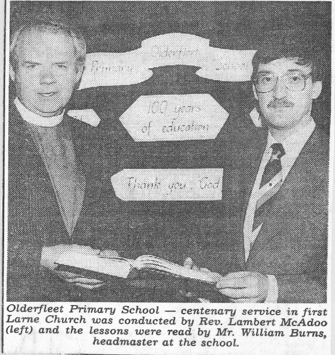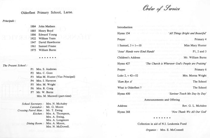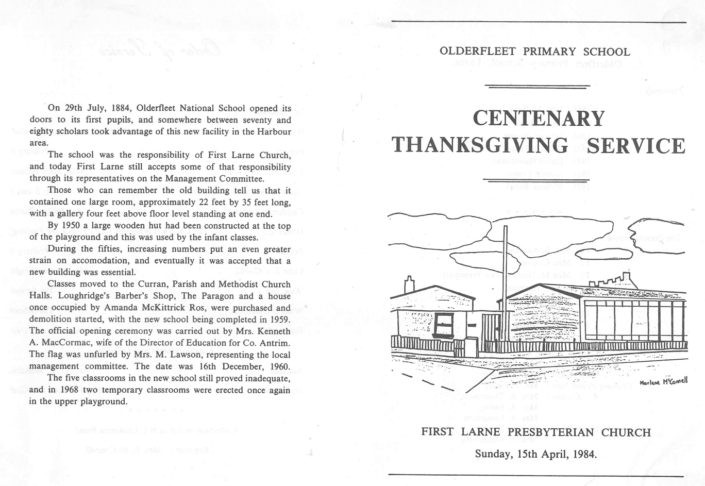 The school was 100 years old. There was a Centenary Thanksgiving Service at First Larne Presbyterian Church on Sunday 15th April. The whole school had a part to play. Prayer P4 – Vickie Gore, Ruth McAuley, Saranne Macrory, Heather Barr, Paula Monteith, Michelle McAuley, Julie Magill. Prayers P6 – Caroline Colman, Colin Craig, David Semple, Alison McMurty, Petra Hynds, Julie Ann Halliday, Anna McAuley. What is Olderfleet – P7 class.