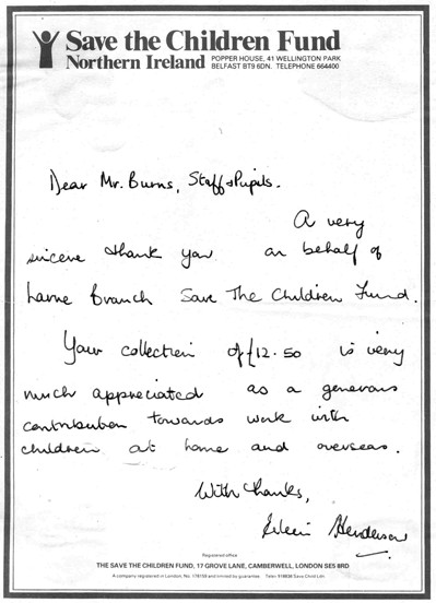 Pupils contributed towards a donation to the N.I. Hospice. Sister McKee came to the school to receive a cheque for £540.