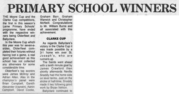 Again Olderfleet won the shield, sharing with Moyle P.S. The swimmers : Helen Colman, Heather Barr, Brian Campbell, Timotnhy Butler, Gareth Alexander, Simon Moody.