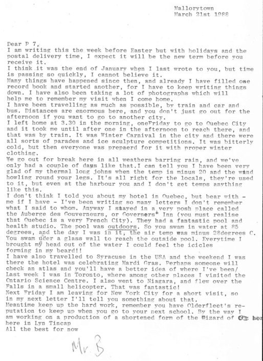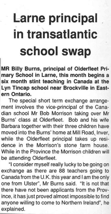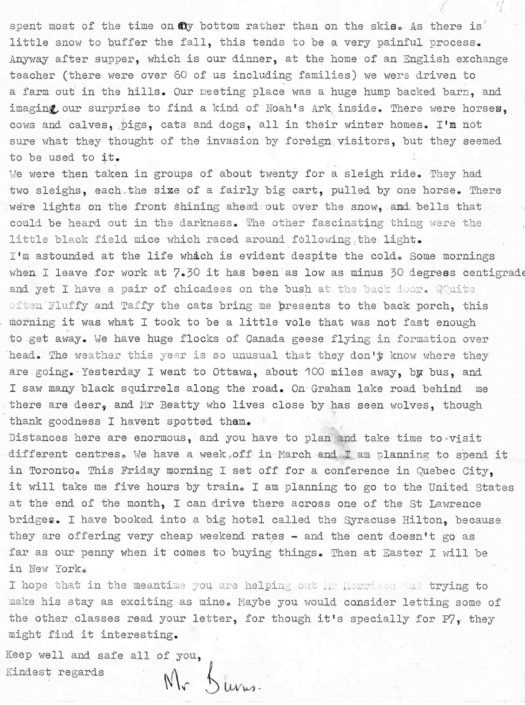 During the Christmas holidays Mr Burns left to spend 7 months on an exchange visit to Canada.