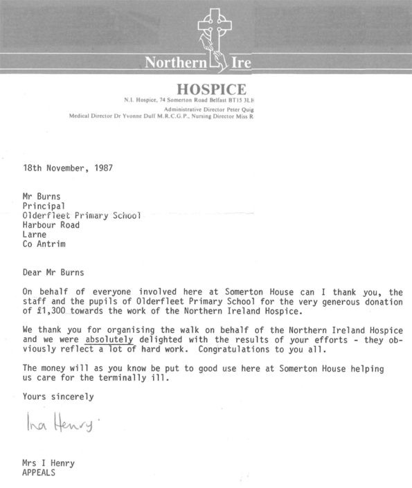 This year’s charity was the N.I. Hospice. We collected £1300. Simon Bell and William Martin handed over the cheque.