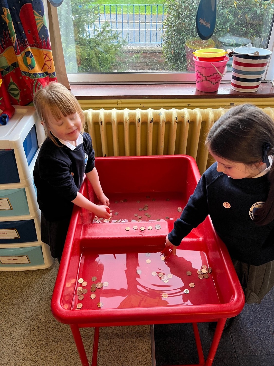 We made coin rubbings, sorted the coins using a Venn diagram, used tweezers to pinch the coins out of the water, counted amounts and then visited the shop beside the school! We chose 1 item and used a £1 to pay before getting our change.